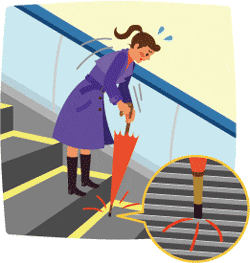 エスカレーターに落とし物をしたら、自分では拾わず、係員を呼んでください。踏段とくしとの間に指を挟んで、大ケガをすることがあります。